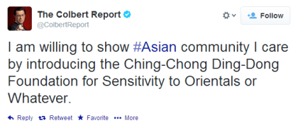 Colbert’s (non-existent, btw) “Ching-Chong Ding-Dong Foundation for Sensitivity to Orientals or Whatever” is a parody of what the Redskins organization is actually doing in actual reality.