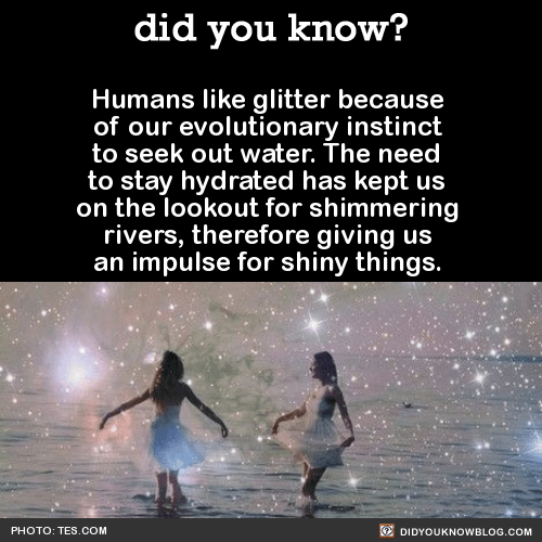 Humans like glitter because of our evolutionary instinct to seek out water. The need to stay hydrated has kept us on the lookout for shimmering rivers, therefore giving us an impulse for shiny things. Source