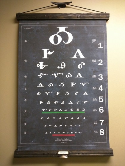 This eye chart in Cherokee lives in my optometrist’s office. The written Cherokee language was created specifically so the tribe could represent themselves in court as they sued the US Government for defaulting on contacts.