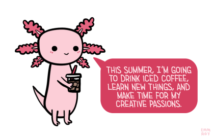 [Drawing of a pink axolotl holding a cup of iced coffee and saying “This summer, I’m going to drink iced coffee, learn new things, and make time for my creative passions.” in light pink text in a pink speech bubble.]