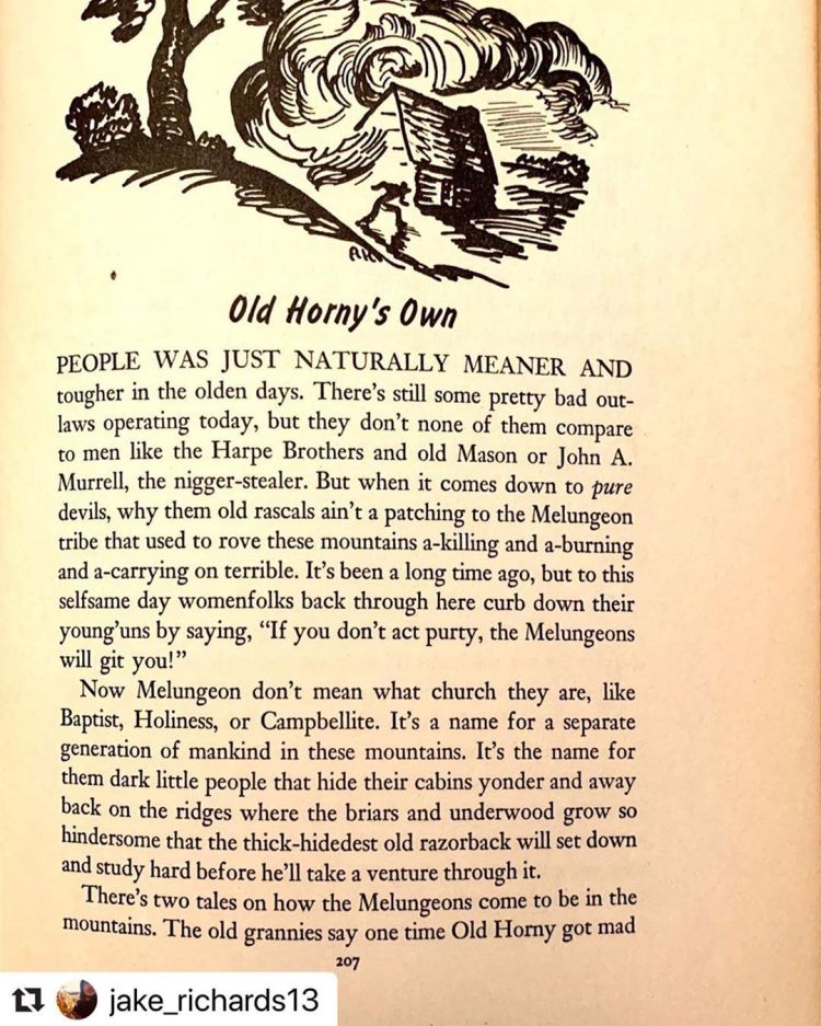 (Warning: Racial slurs are present in this book.) For those who don’t know why Melungeons of Tennessee (like my family) hid in the mountains or why Silas is so afraid of people in Ellistown…well, here it is. Silas deals with more problems in The Thundering Ones, and portrayals like this are the reason. Up until probably the 1960s, Melungeons were considered demons and non-human, only because we were mixed. I know in my family, we were dark-skinned, just tan, Cherokee, or Indian, never Melungeon or Black. The book is called “God Bless the Devil” by James R. Aswell, published in 1940. #melungeon #folktales #easttennessee